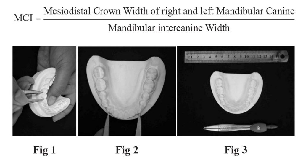 The study was conducted after approval from ethics review committee of Ziauddin University (# 00140416SGOBIO). After getting the informed consent form signed, mandibular impressions of the subjects were taken using impression material (alginate) in a perforated tray. After disinfecting the impression, high strength plaster was poured in the impression to obtain the cast (working model). Patient number was assigned after trimming the cast. Mandibular study casts were prepared in dental stone and measurements were taken by using divider and steel scale.(Fig 1) Canine width was taken as the greatest mesiodistal diameter of canine on either side of mandibular arch.(Fig 2) The inter-canine distance was measured as the linear distance between the cusp tip of right and left mandibular canine.(Figure 3) Mandibular Canine Index(MCI) was calculated by formula.17