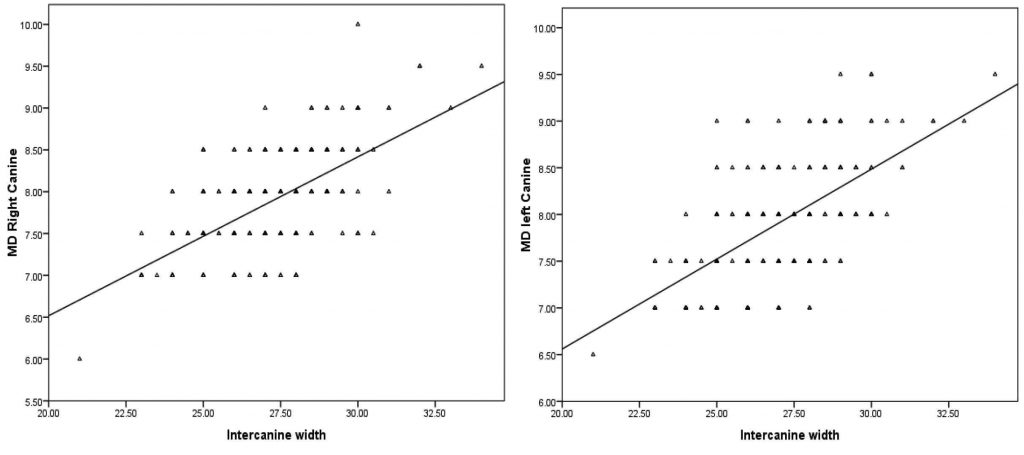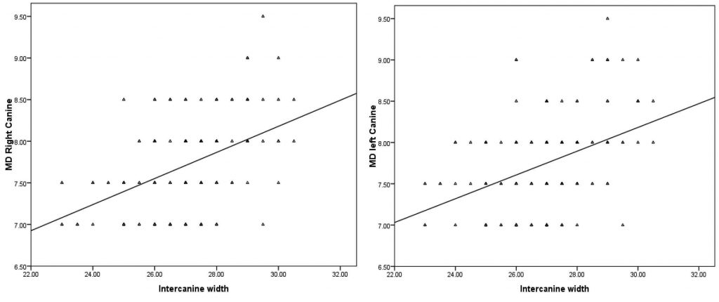 Graph 2: Graphical representation of correlation between Inter canine width and MD right Canine, MD left Canine in female.