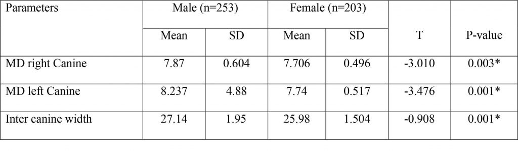 The study group consisted of 456 subjects (253 males and 203 females). After the violation of normality assumptions, instead of independent sample T test; Mann Whitney U test was used to compare the mean value of MD right canine, MD left canine, & inter canine width to see the gender dimorphism. The mean value of mandibular right and left canine and intercanine distance in males was more than females showed statistically significant differenceas depicted in Table 1.