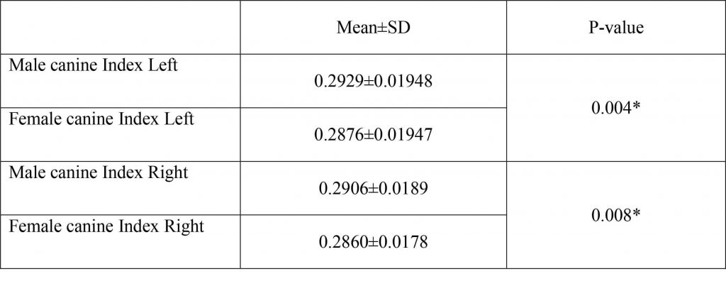 RESULTS: The mean value of mandibular right and left canine and intercanine distance in males was more than in females and showed statistically significant difference. Mann Whitney U test was applied to see the gender dimorphism in values of mean canine index (right and left side) and statistically significant difference was also found (P? 0.05).
