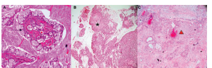 Figure 1: Photomicrograph showing the (A) cystic component with mucous cells (MC)(represented with black arrows) of low grade mucoepidermoid carcinoma on higher magnification(B) Intermediate grade mucoepidermoid carcinoma consisting of both cystic and solid areas (black star) (grade II – both cystic and solid type) (C) High grade tumor of mucoepidermoid carcinoma with solid island predominating over the cystic one having epidermoid cells (triangle)(solid variant) (H&E, 40X H&E,10X).