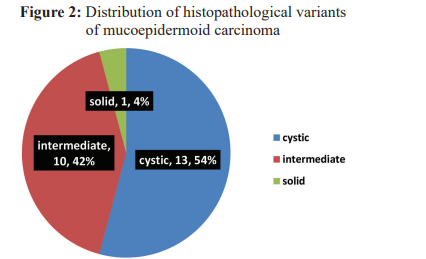 In current findings, the most prevailing site reported MEC was parotid gland followed by submandibular and minor salivary glands respectively. The studies conducted both nationally and internationally, also documented the similar findings as the parotid gland the most commonly involving site.18 The highest involvement of parotid as compared to other glands is attributed to varying cell types that are present as compared to other salivary glands. Other reasons can be gland size and its proximity to the lymphatics and nerves.3