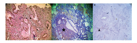 Figure 3: Photomicrograph showing (A) low grade mucoepidermoid carcinoma with strong cytoplasmic expression (black arrow) of immune-marker. (B) Intermediate grade mucoepidermoid carcinoma showing moderate cytoplasmic expression (black star) (grade II – both cystic and solid type).(c) High grade tumor of mucoepidermoid carcinoma (solid variant) with week expression of tumor marker (triangle) (IHC;10X).
