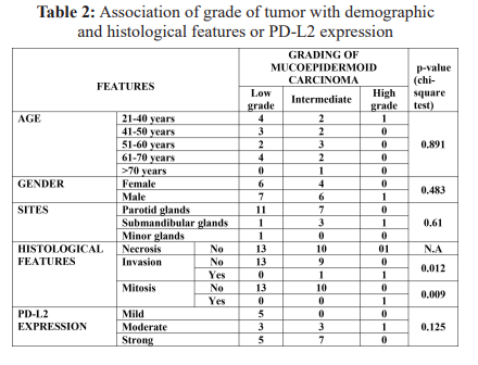 Multivariant analysis was performed to determine the association of demographic features and tumor grade with PD-L2expression. Statistically no significant association was found between age, gender, site, PD-L2 expression and tumor grade in patients having MEC as summarized in table 2. However, histological invasion and mitotic activity showed a significant association with tumor grade (P=.012 & P=.009) (Table- 2).