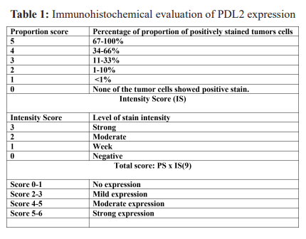 This descriptive cross-sectional study was conducted in the Department of Oral Pathology and Morbid Anatomy and Histopathology, University of Health Sciences, Lahore, Pakistan from January 2019 to June 2019. Both males and females of any age with first time diagnosed MEC from different tertiary health care hospitals of Lahore were included, while patients with recurrent tumor and other co-morbid conditions were excluded. Demographic data including age, gender, site of involvement was noted. Histopathological grading was done into low, medium and high grade according to Seethala’s classification system, based on cellular atypia, cyst formation and types of cells (Seethala, 2009a). Immunohistochemistry was conducted by using PD-L2 (1:200, clone 175511, monoclonal mouse, cat # MAB 1224, R&D system, USA). PD-L2 expression was evaluated on basis of extent and intensity of immuno-labeling in tumor cell cytoplasm. Total score for each case was calculated by multiplying the proportion score (PS) and intensity score (IS) as shown in table.