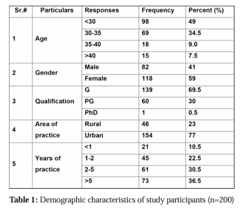A response rate of 96% was achieved by including all 200 of the study’s 450 dental professionals. The majority (49%) of study participants were under 30 years old, and 59% of them were female. The majority of participants (69.5%) had a BDS qualification. Summary of demographic characteristics is given in Table 1.