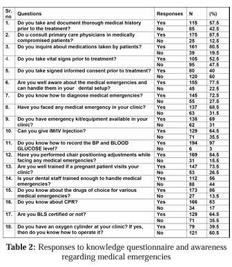 METHODOLOGY: A prospective study including 208 practitioners were given access to the survey through Google Form, along with information on the study and a consent form .The questionnaire consisted of demographic details, years of experience, and specialty of practitioners and 20 closed-ended questions with 10 assessing knowledge and rest evaluating the competence and preparedness to handle medical emergencies. An emergency whether medical or dental is a serious, acute, and unexpected event that requires a quick and timely intervention. Since some diseases and their treatments increase the likelihood of a medical emergency during dental treatment. The most often encountered medical emergencies in a dental office are vasovagal syncope, angina pectoris, hypoglycemia, and hypertensive crisis. One of the mainstays of prevention of medical emergencies is by taking a thorough and detailed history, and vital signs monitoring and modifying the treatment plan.