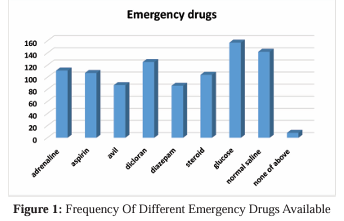 Amiri et al.1 suggested that dental clinics stock six critical medications. These are aspirin, nitroglycerin, albuterol/salbutamol, antihistamine, oxygen, and epinephrine. Oral glucose (78.5%) normal saline (71%) adrenaline (62.5%) were the most readily available emergency medication in our study .These findings are consistent with those of Hussein et al.16 Gupta et al.5, Al Qahtani et al.4 Al Ghanam et al.13