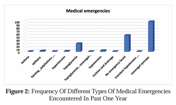 saline, adrenaline, aspirin, steroids, avil, and diazepam were the most often found emergency medications in emergency kits as reported by the participants of our study shown in figure 1. Most common medical emergency is vasovagal syncope according to current study as shown in figure 2. In term of gender, there was a significant association found with taking consent from patient prior treatment, trained to deal with pregnant patients and BLS certified. Females were