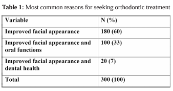 Among 300 individuals (170-female and 130-male), Improvement in facial appearance was the most popular reason for seeking orthodontic treatment (180/300), although other functions like mastication, better oral health and communication were also mentioned by 120 patients (Table 1).