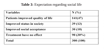 While 70% (210) thought that they would receive treatment, they would be more accepted by society and thus would improve their social standing, while the remaining 30% (90) thought that it made no difference.