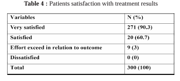 The results of the second portion of the questionnaire showed that the majority of patients thought that either the treatment’s results met or, at the very least, exceeded their expectations, only 3% (09) people thought the effort was too great compared to the result, but no one expressed complete dissatisfaction (Table 4).