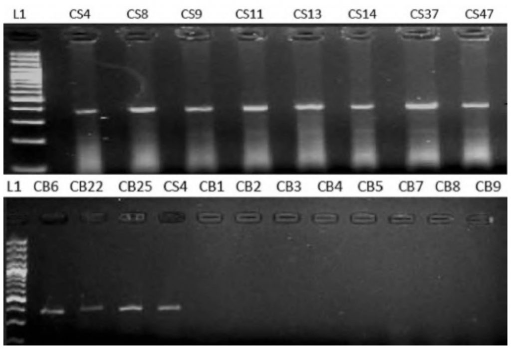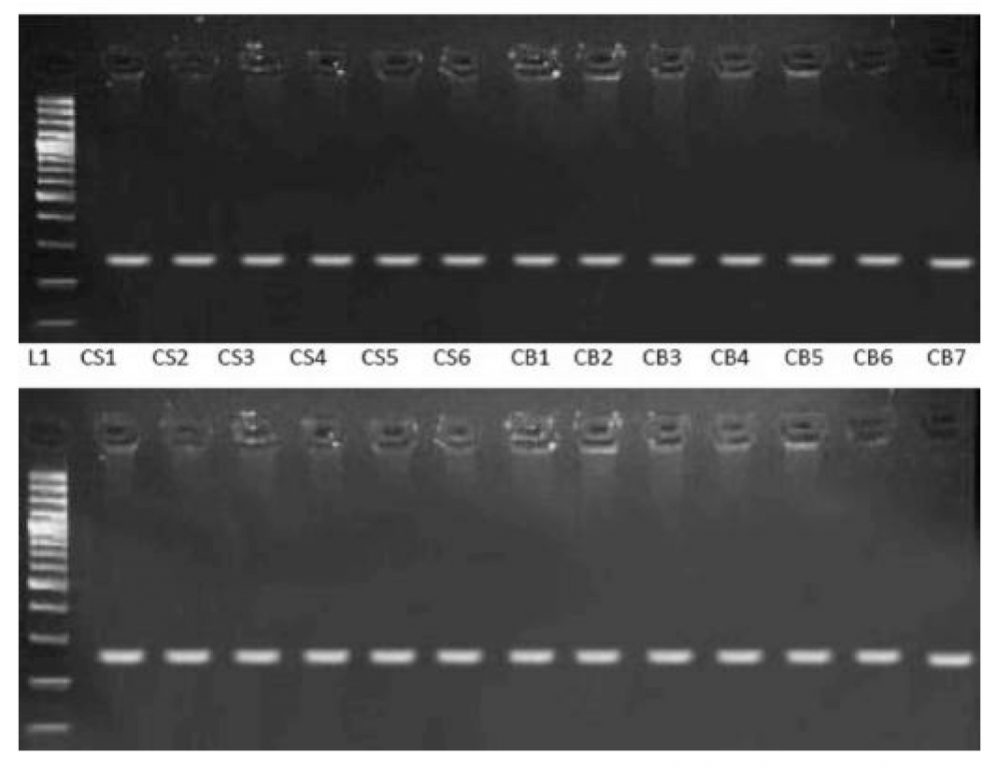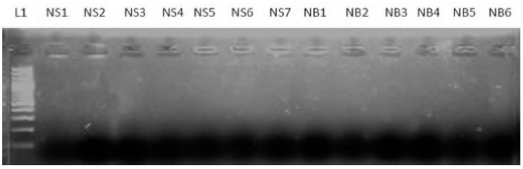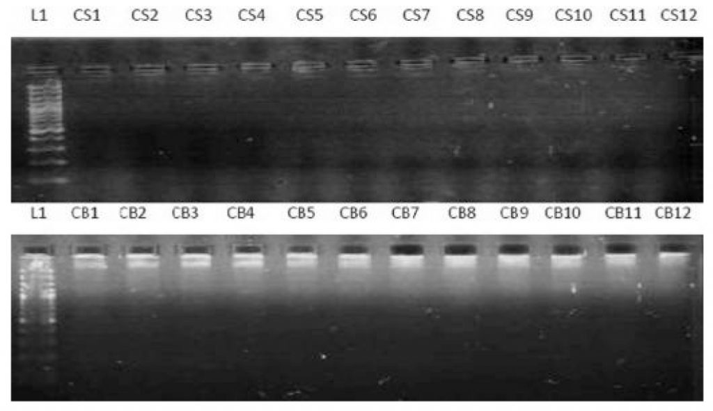 L1: Lane of 100 bp ladder, Lanes NS1-NS6: Saliva samples Lanes NB1-NB7: Blood samples, Lanes CS1-CS6: Saliva samples Lanes CB1-CB7: Blood samples