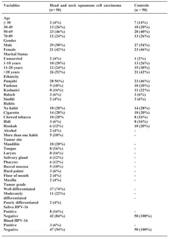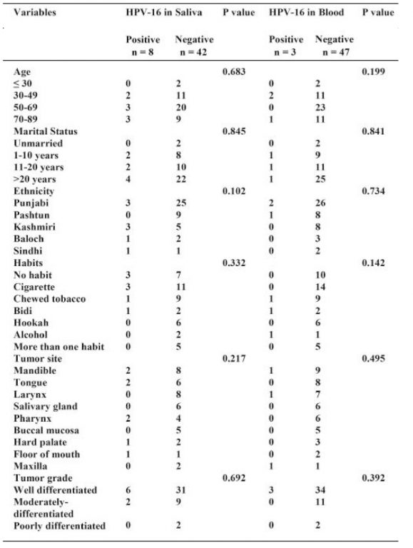 METHODOLOGY: A total of 200 samples comprising 100 blood and 100 saliva samples were collected. Hundred samples (saliva; n=50, blood; n=50) were collected from histopathologically confirmed head and neck squamous cell carcinoma patients and 100 samples (saliva; n=50 saliva, blood; n=50) were collected from healthy individuals without a history of cancer as controls. HPV-16 was detected using conventional polymerase chain reaction and gel-electrophoresis. The frequency and distribution of clinicopathological variables were calculated in percentages. Chi-square test was used to analyze the association of HPV-16 positivity with clinicopathological variables.