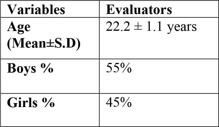 The mean age of the evaluators was 22.2 ± 1.1 years, with 55% being males. (Table I).