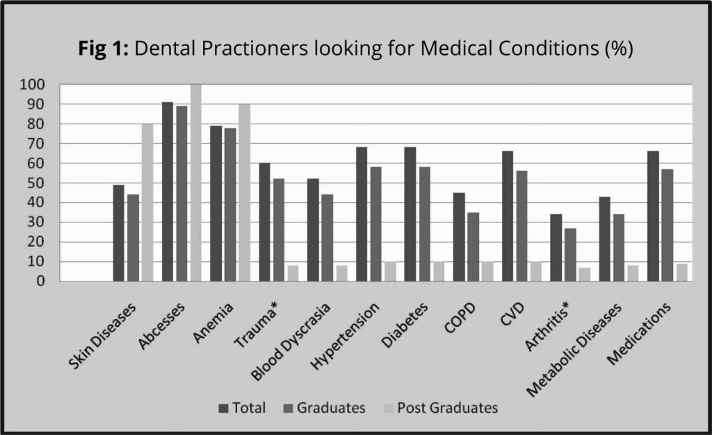Seventy-nine percent (79%) dentists (85% graduates and 15% postgraduates) participants reported that they look for medical conditions while examining dental patients. Postgraduate dentists were having better level of awareness and practice about systemic diseases as compared to the graduate dentists. The highest level of awareness (98%) was about hypertension and diabetes mellitus while the lowest level (49%) was about Skin diseases and arthritis. Statistical significant level of difference of awareness between graduates and postgraduate was observed only for Arthritis. (p<0.05) (Fig 1)
