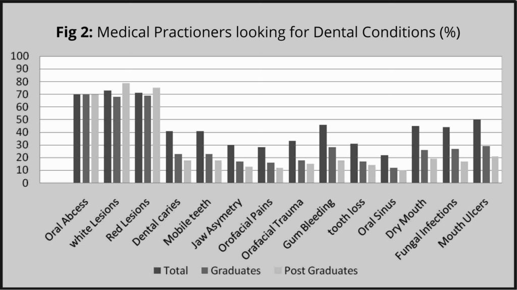 Oral health is involved in systemic conditions through the centuries, however, an understanding of the connection between oral-systemic conditions is still emerging.12 In contemporary years, the connection between oral and systemic diseases has become an important topic for research.13 Regardless of the growing information about oral-systemic connections, practicing physicians and dentists have little knowledge and poor attitude about this topic and their information needs are negligible.13 However limited studies have explored status of awareness among medical professionals regarding the relationship between oral diseases and systemic health.14 Our literature search have seen that many more studies regarding the oral health awareness of medical professionals is focused on periodontal disease. Physicians may have a fundamental role in oral health if they are managed to have basic dental knowledge and examine oral cavity regularly for identification of many conditions at initial stages.15,16 Dentists also have some unmet medical information when they treat dental patients having systemic conditions in daily practice. Studies report that about half of the dentists observed clinical-guidelines or appropriate interventions to treat dental patient with medical co-morbidities.11,13 Oral health problems are frequently overshadowed by other health needs, which are perceived to be more obvious and urgent by the attending physician, the individual patients themselves, and their relatives.17