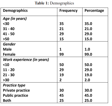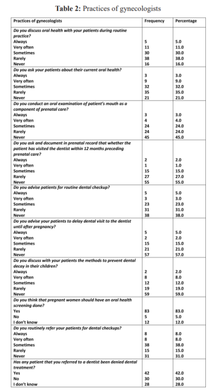 The questionnaire inquired the gynecologists about advising and referring pregnant patients to dentist during pregnancy, keeping record of last dental visit and performing oral examination, knowing the association between periodontal diseases and adverse birth outcomes prevalent in pregnancy. Lastly, the associated barriers while maintaining oral health during pregnancy were asked. The data obtained was analyzed using SPSS version 20 and pvalue of less than 0.05 was taken as significant. Chi-square was used to find out the associations.
