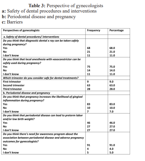 Gynecologists had consensus on safety of dental x-ray (68%) and local anesthetic used with vasoconstrictor (75%). The second trimester was considered favorable for dental treatments (63%). The association between pregnancy and gingivitis was well known (83%) but antenatal care providers had dilemma about preterm birth and low birth weight outcomes of periodontal diseases (27%), so they agreed strongly to arrange awareness sessions regarding association between adverse birth outcomes and periodontal diseases.