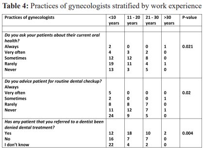 Dental treatments are safe during pregnancy but many gynecologists (77%) reported that dental treatments were denied by dentist many times which is in accordance to our findings.13 Gynecologists had no doubt about safety of dental x-ray, use of local anesthetic with vasoconstrictor and best trimester for dental treatments similar to previous studies.14 Our study showed a statistically significant relation between work experience of gynecologists and their practices of asking and advising patients about oral care. However there was no correlation noted between work experience and referral practices unlike Mariano da Rocha et al21 and Resul turabi et al18 findings. Work experience also had statistically significant relation with knowledge about association between adverse birth outcomes and periodontal diseases (p-0.019).