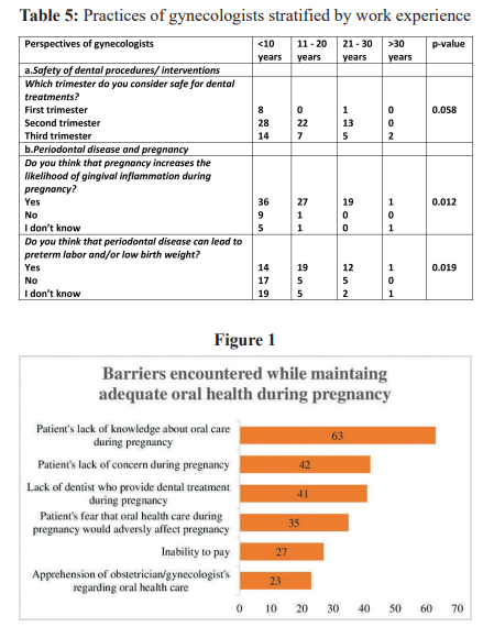 (91%). Statistically significant associations were found between work experience and knowledge about gingivitis in pregnancy (p-value 0.012) as well as that of periodontitis with adverse birth outcomes (p-value 0.019). Other associations are also shown in Table 4 and 5. The perspective of gynecologists about barriers in maintenance of suitable oral health during pregnancy are listed in Figure 1.
