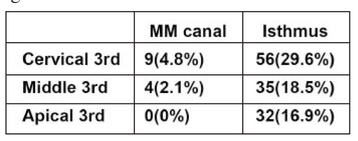 Table 3: Distribution of middle mesial canals and isthmus according to their incidence in different sections of the root