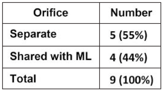 while there was no significant difference between the two sides (Table-2). The distribution of MMC and isthmi according to their presence in different views is listed in Table-3. The distribution of MMC and isthmi according to their start and end is listed in Table-4. The orifices of