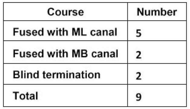 5 MMCs (55%) were separate, the rest were shared (45%) with ML canal (Table-5). Five MMCs fused during their course with the ML canal, two fused with MB canal and two ended blindly (Table-6). Neither any of the middle mesial canals exited from separate apical foramina, nor were observed in the roots’ apical third. Presence of isthmus in