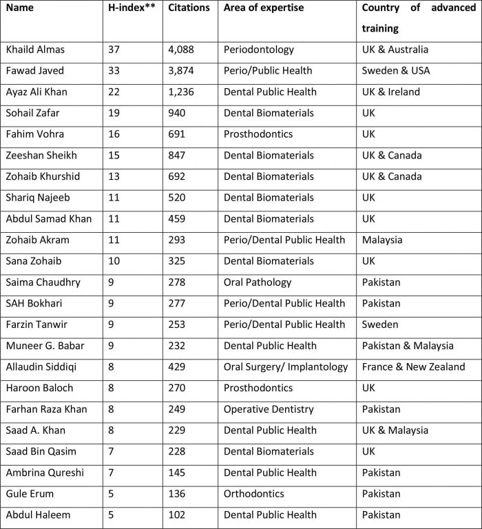 * The list is not comprehensive as some important names and data may be missing. A number of very well published research-active authors such as Drs. Mubassar Fida, Attiya Shaikh, Irfan Qamruddin, Aneel Bherwani, Ninette Banday, Robia Ghafoor, Fahad Umer, Ashar Afaq, Fahad Kidwai, Umer Dawood and others were not registered with Google scholar profile.