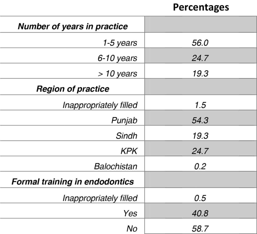 This was a cross sectional survey of the general dental practitioners working in different academic institutes of Pakistan and involved in performing endodontic procedures either in academic or private capacity. A prior approval from the relevant institutional review board was acquired and a pre-piloted questionnaire survey adopted from Savani et al with slight modifications was used.1 The questionnaire comprised of 22 questions addressing different aspects of the endodontic treatment. In order to maintain anonymity the respondents were not asked to identify themselves. Also, the investigators were blinded as to the identification of the respondents but the details pertaining to years of practice and region of practice were recorded.