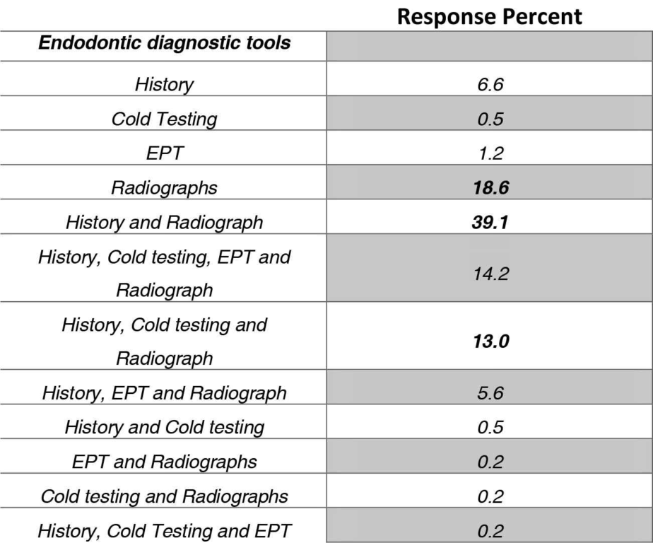 Establishing a proper diagnosis is the first step in delivering appropriate treatment to a patient, various aids have been recommended to help guide the endodontist in this task. Although cold testing has been recognized by the literature to be more accurate in eliciting proper pulpal response and the subsequent diagnosis, only 13% of the practitioners relied on cold testing in this survey. The majority of the respondents (39.1%) used history and radiographs alone to establish endodontic diagnosis. In contrast a survey of Iranian dental practitioners revealed about 38.5% of the respondents performed pulp sensibility tests prior to performing root canal therapy.8