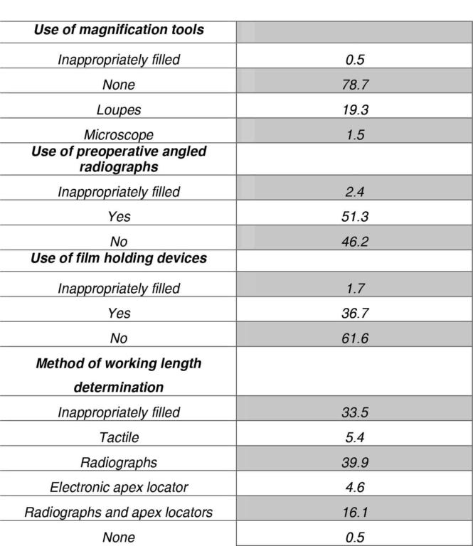 RESULTS: A total of 409 completed questionnaires were returned bringing the response rate to about 79%. Most of the respondents performed more than 10 root canal treatment procedures in a month (51.8%) comprising of a combination of anterior and posterior teeth including retreatment cases (40.1%). The diagnosis of endodontic cases was primarily established by history and radiographs alone (39.1%). Only 19.3% of the respondents reported the use of dental loupes for magnification. The use of preoperative angled radiographs for endodontic procedures was reported by 51.3% of the respondents while only 36.7% made use of film holding devices. About 46.9% reported only occasional use of rubber dam. Most preferred obturation technique and type of endodontic sealer was identified as cold lateral compaction (53.1%) and Calcium hydroxide (32.5%) respectively. While 68.5% respondents preferred multiple appointments with Calcium hydroxide as the most commonly used intracanal medicament (57.2%). The use of anesthesia was restricted to access preparation (36.9%) while 44.5% relied on a combination of antibiotics and NSAIDs for interappointment pain management. Radiographs (39.9%) were the most preferred means for working length determination. Sodium Hypochlorite (39.1%) was the most preferred irrigant with 63.6% making occasional use of EDTA. Activation of irrigants (58.4%) was not routinely employed and use of NiTi (54.5%) rotary instruments was reported to be occasional.