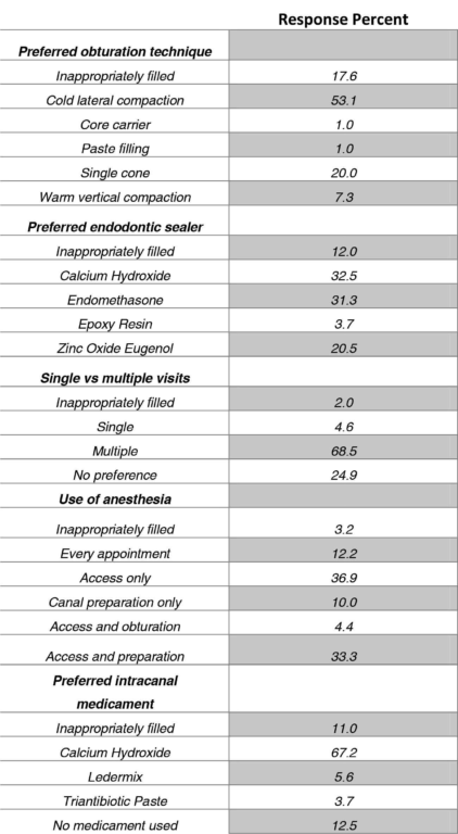 Table 4: Preferred obturation technique, endodontic sealer, number of appointments, use of anesthesia and preferred intracanal medicament