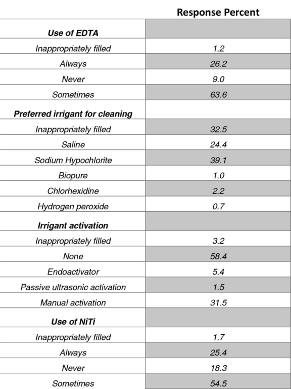 With respect to cleaning and shaping, table 5 highlights the preference for irrigants, use of EDTA, activation of irrigants and the use of NiTi rotary instruments for shaping root canal space.